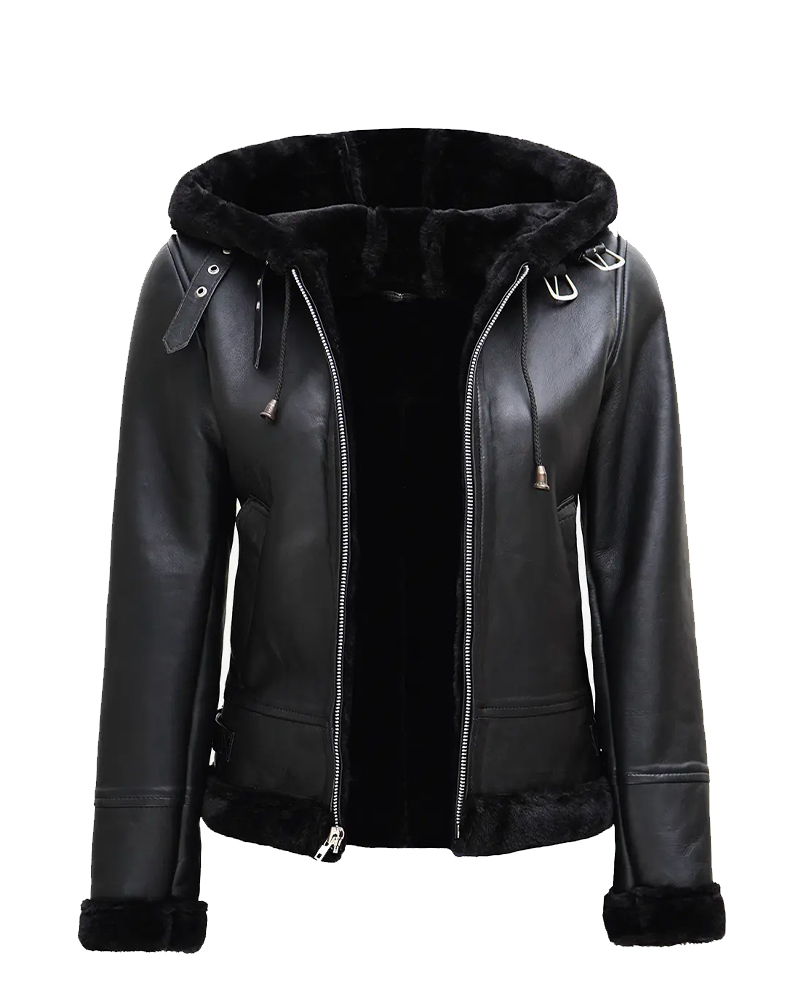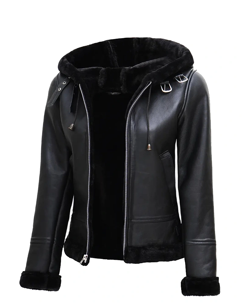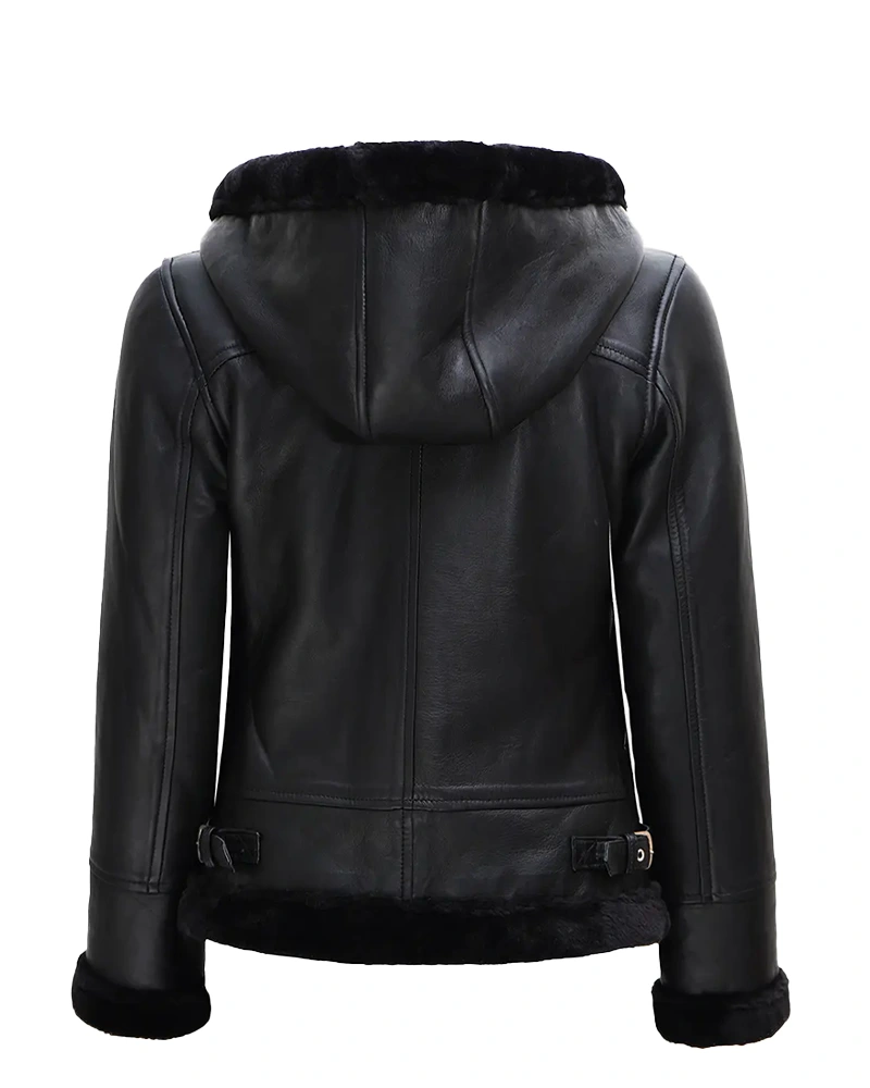 SKU: womens-black-leather-hooded-shearling-jacket-parent Category: